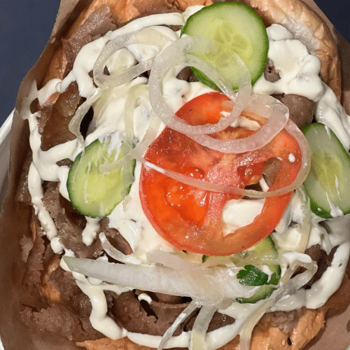 mięso, frytki, surówka, warzywa (pomidor, ogórek), sosy (2 sosy do wyboru)